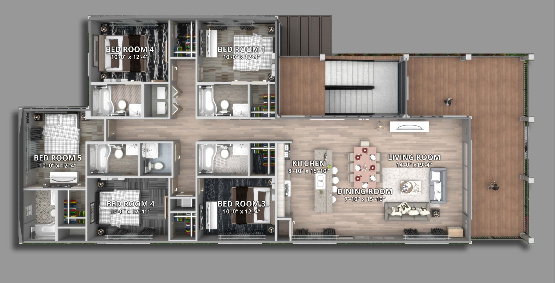 5 bedroom, 5.5 bathroom unit, all stainless steel appliances, granite counter tops, large covered balconies, wood-type flooring throughout.