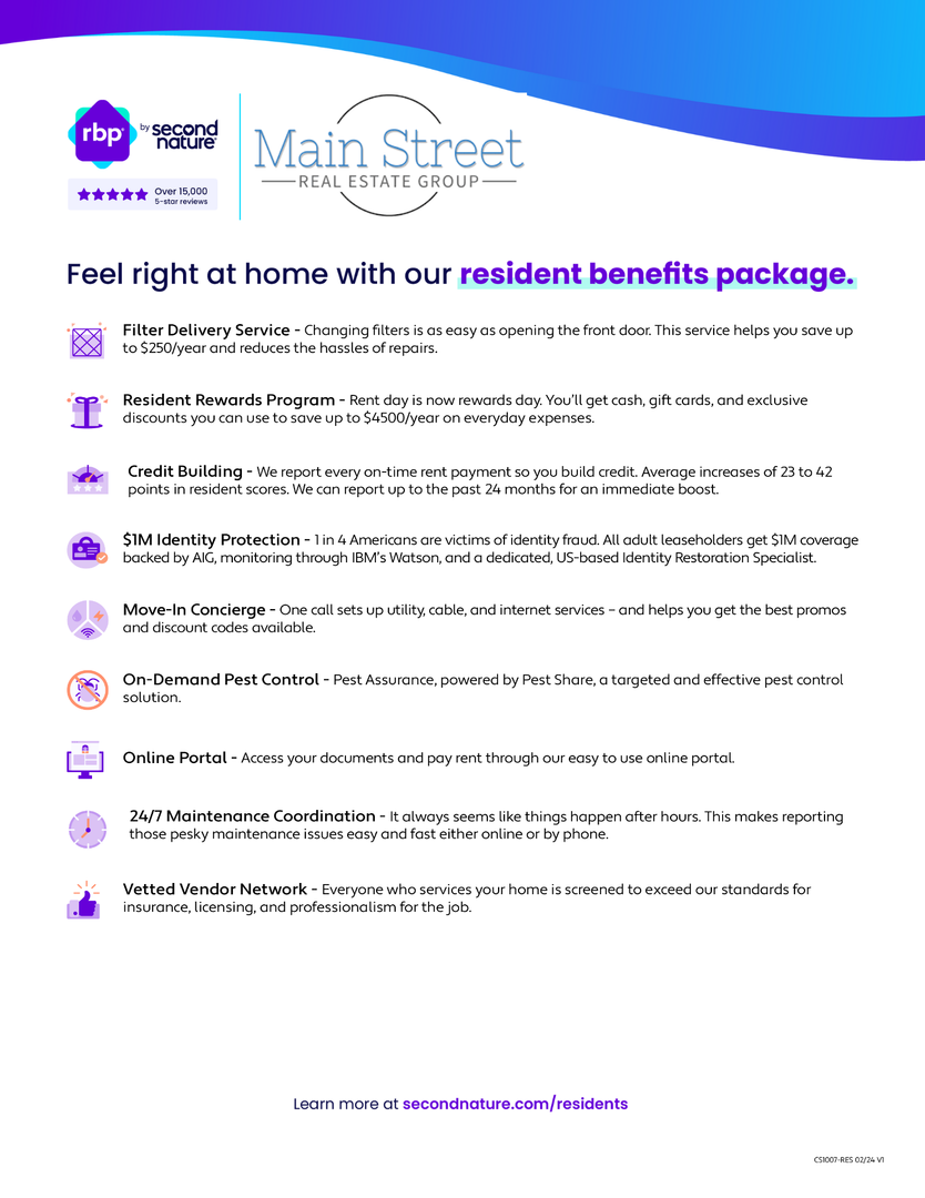 At Main Street Real Estate Group, we strive to provide an experience that is cost-effective and convenient. That’s why we include a Resident Benefits Package (RBP) to address common headaches for our residents.