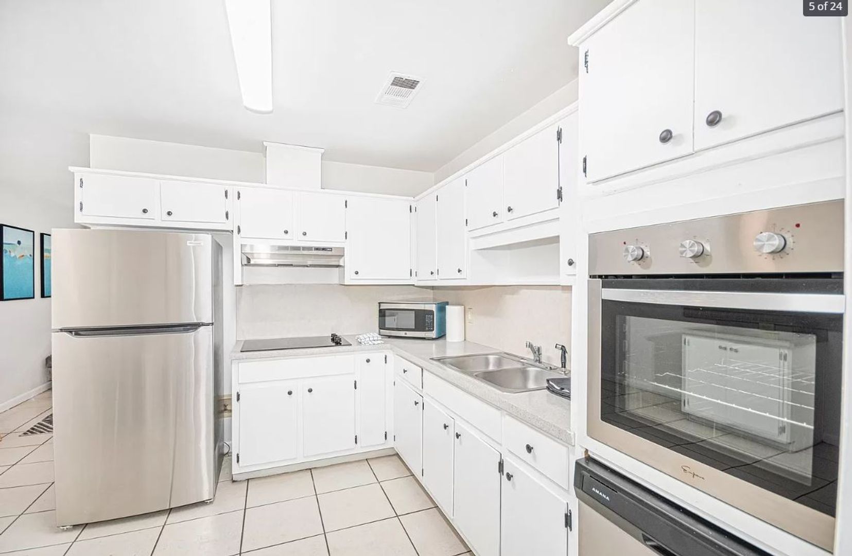 Tile throughout, stainless steel appliances. Comes with 2 tvs and bar. Covered back porch, large fenced-in back yard.